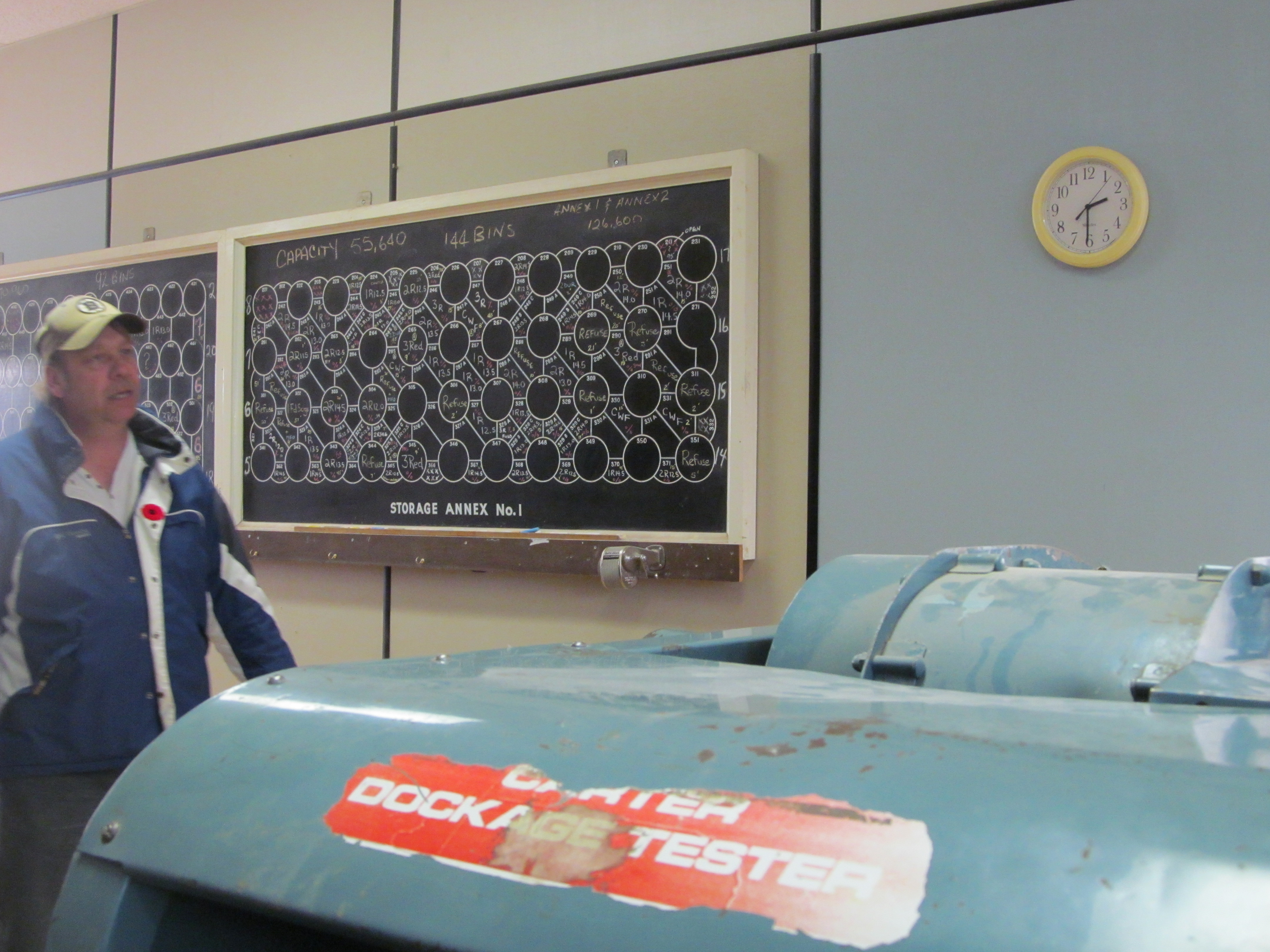 Above is the chalk board of the 236 bin system used for storage.  Blending of the grain when loading the ships is still done by opening multiple bins with a hand crank below and touring where the grain cars are unloaded still using a cable and hook system.