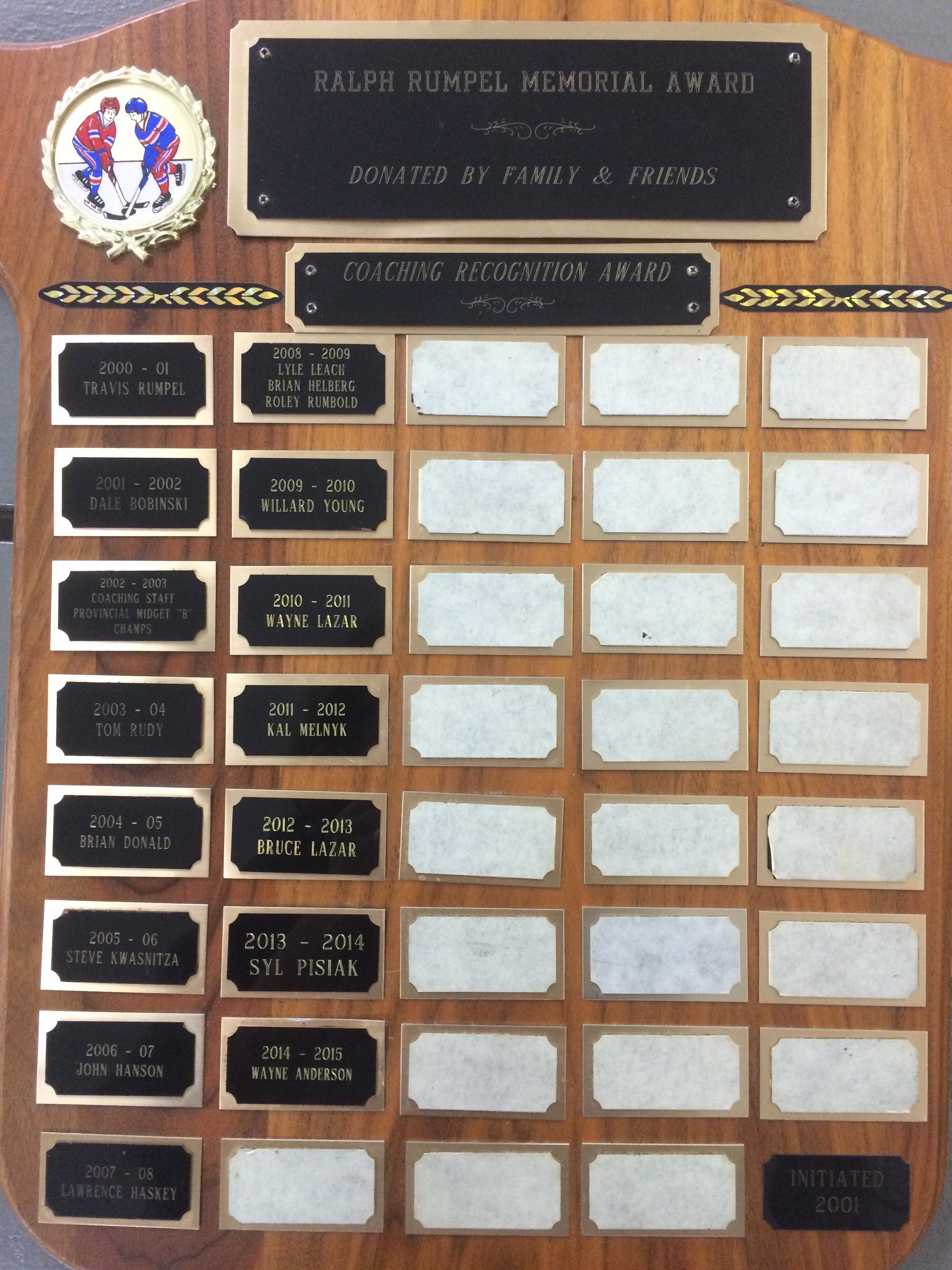 The Ralph Rumple award. The WMSA has been asked by the family to choose a individual every year to be recognized for exemplary dedication towards minor hockey in Wadena.